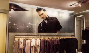 For the window display of the Reiss store in Blue Water, Kent, we placed a solid image of a face on to an MDF panel and then printed the same face on to an acetates sheet and hung it directly in front to create a 3D effect. Inside, we mounted printed acetate sheets behind glass sections and attached them to the ceiling.